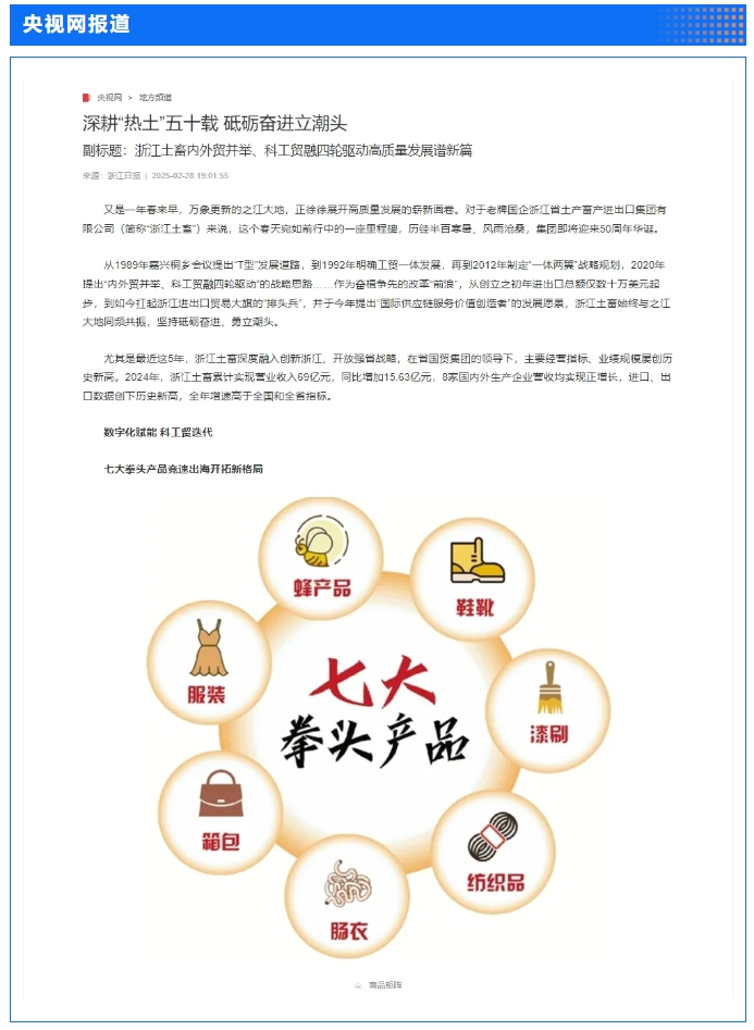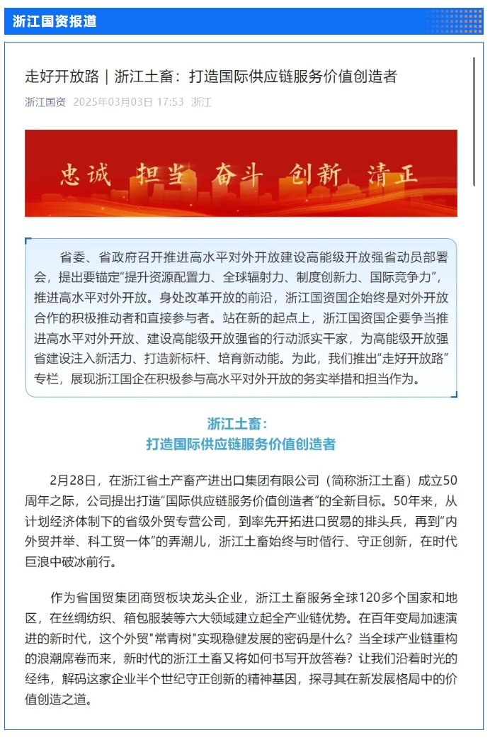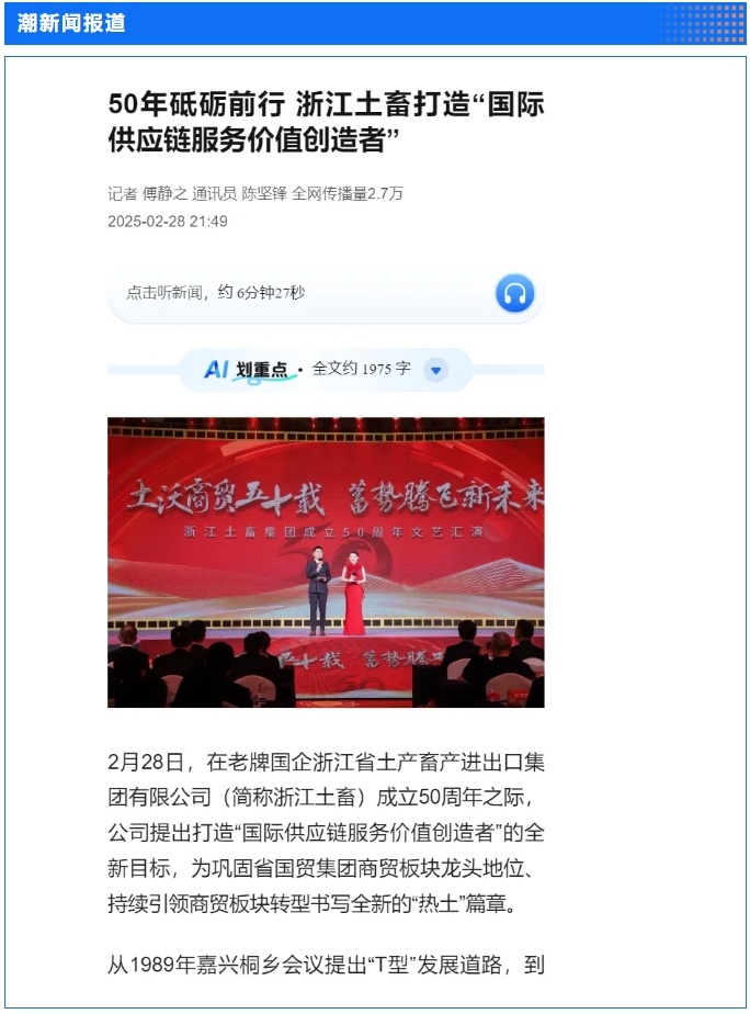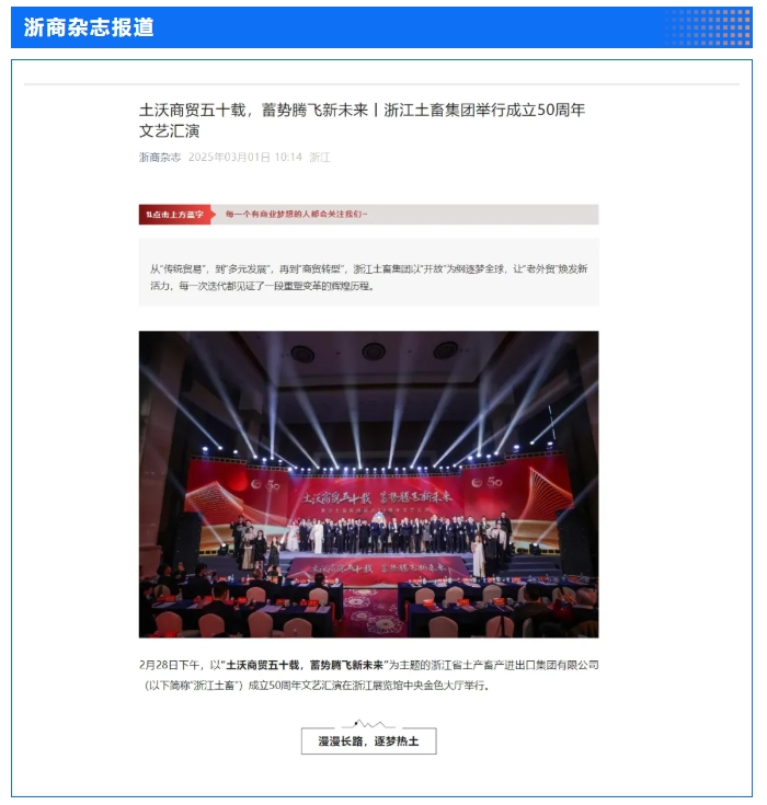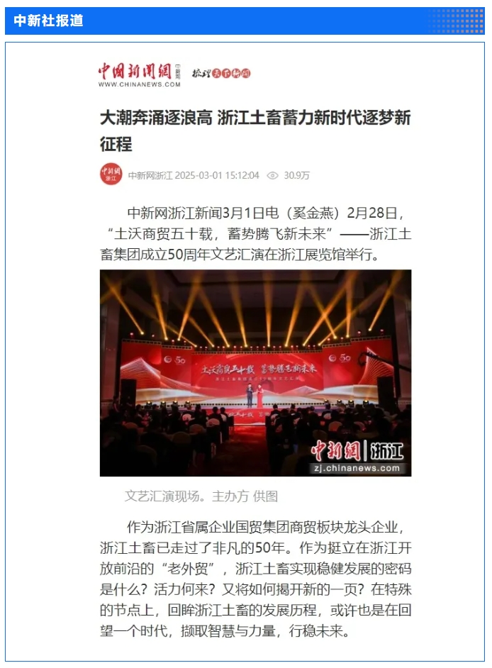 2月28日,“土沃商貿(mào)五十載,蓄勢騰飛新未來”——浙江土畜集團成立50周年文藝匯演在浙江展覽館中央金色大廳舉行。匯演生動展現(xiàn)了省國貿(mào)集團下屬浙江土畜一路走來的蝶變歷程,更憧憬展望了浙江土畜美好未來。中新社、央視網(wǎng)、浙江日報、浙江國資、浙江在線、潮新聞、浙商雜志等多家媒體對匯演進行了報道。